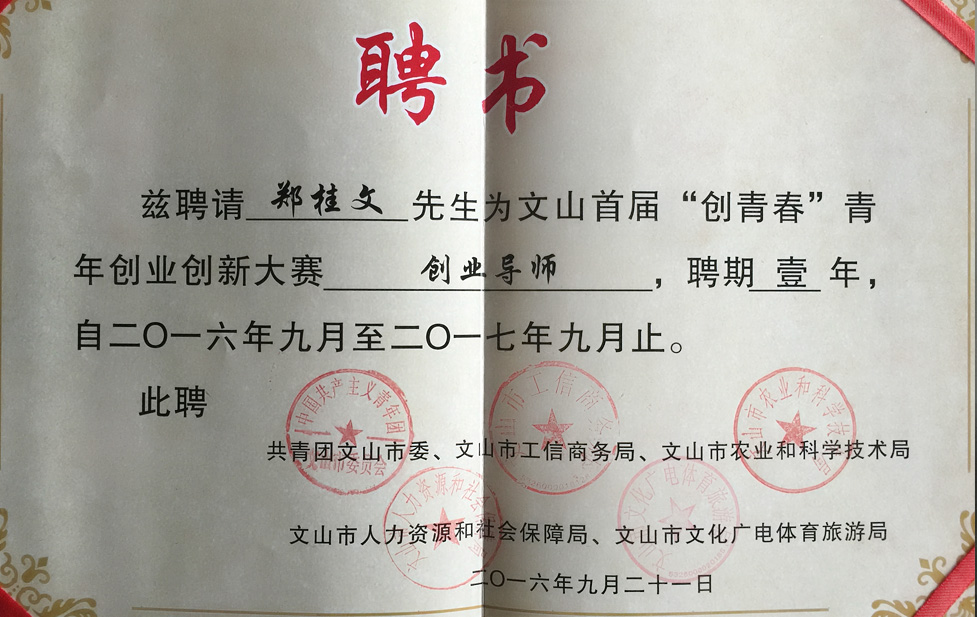 2016年9月21日10点,由文山市委副书记刘建萍同志宣布:文山市首届‘创青春’青年创业创新大赛正式启动,并为尊龙凯时集团董事长郑桂文等五位创业导师颁发了导师聘书。