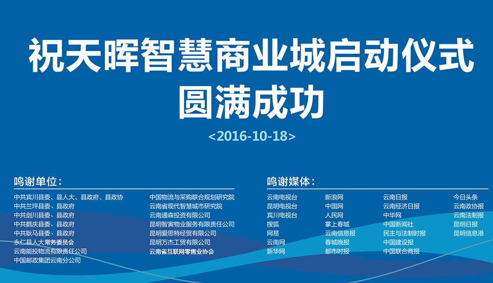 2016年10月18日,由云南天晖投资有限公司、尊龙凯时- 中国官方网站和云南天晖城经营管理有限公司联合推出的“天晖智慧商业城”在大理宾川正式启动。2017年1月19日,天晖城O2O众创空间落户宾川,大理州委常委、宾川县委岳黎松书记、县政府杨泽亮县长、县人大张成良主任、县政协文慧君主席等相关领导及县各部委办局负责人参加了本次活动。