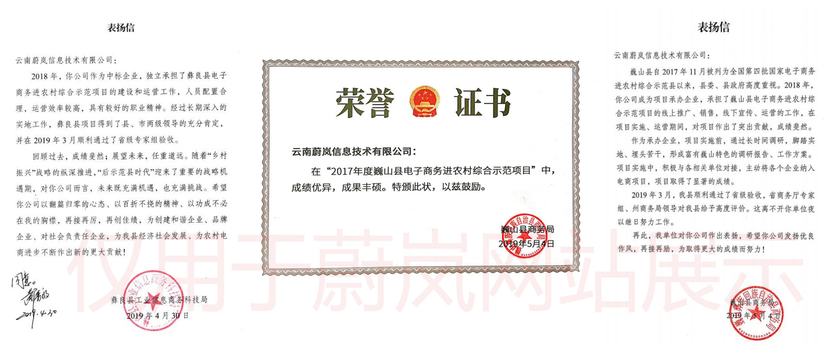 蔚岚公司在积极实施全国电子商务进农村综合示范县项目期间,以市场主导与政策推动相结合、整县(市 、区)推进与示范带动相结合、农村产品上行与工业品下乡相结合、综合示范与跨境电商相结合,打造农村电商双向流通渠道,不断创新农村电子商务发展模式和工作推进机制。高效整合城乡电子商务一体化体系和电商产业园区,完善农村电子商务公共服务体系;发挥当地优势,促进基地(合作社)+电子商务相结合的经济模式,探索农村电商+跨境电商、对外贸易+跨境电商的融合发展模式,将农村电子商务与跨境电子商务有机结合培育具有持续经营发展能力的农村市场主体。带动农民、贫困户增收,推动农村电子商务成为农业现代化的新动能、新引擎,获得当地政府一致表扬和肯定。
